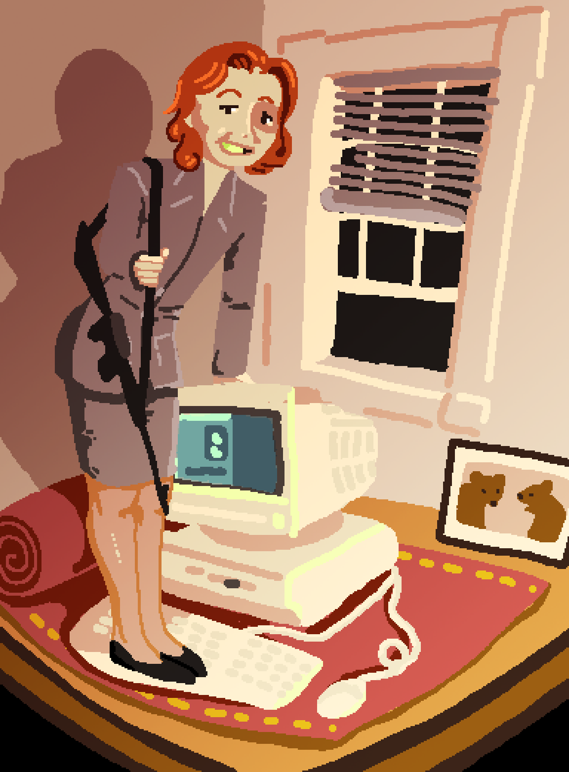 originally it was going to be a more straightforward rendition of the reference photo but with all the sketch layers revealed, it looked like she was standing on the keyboard so i went with that instead. i like the idea of redrawing photos but adding my own spin. tee hee