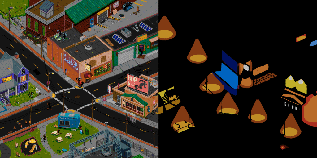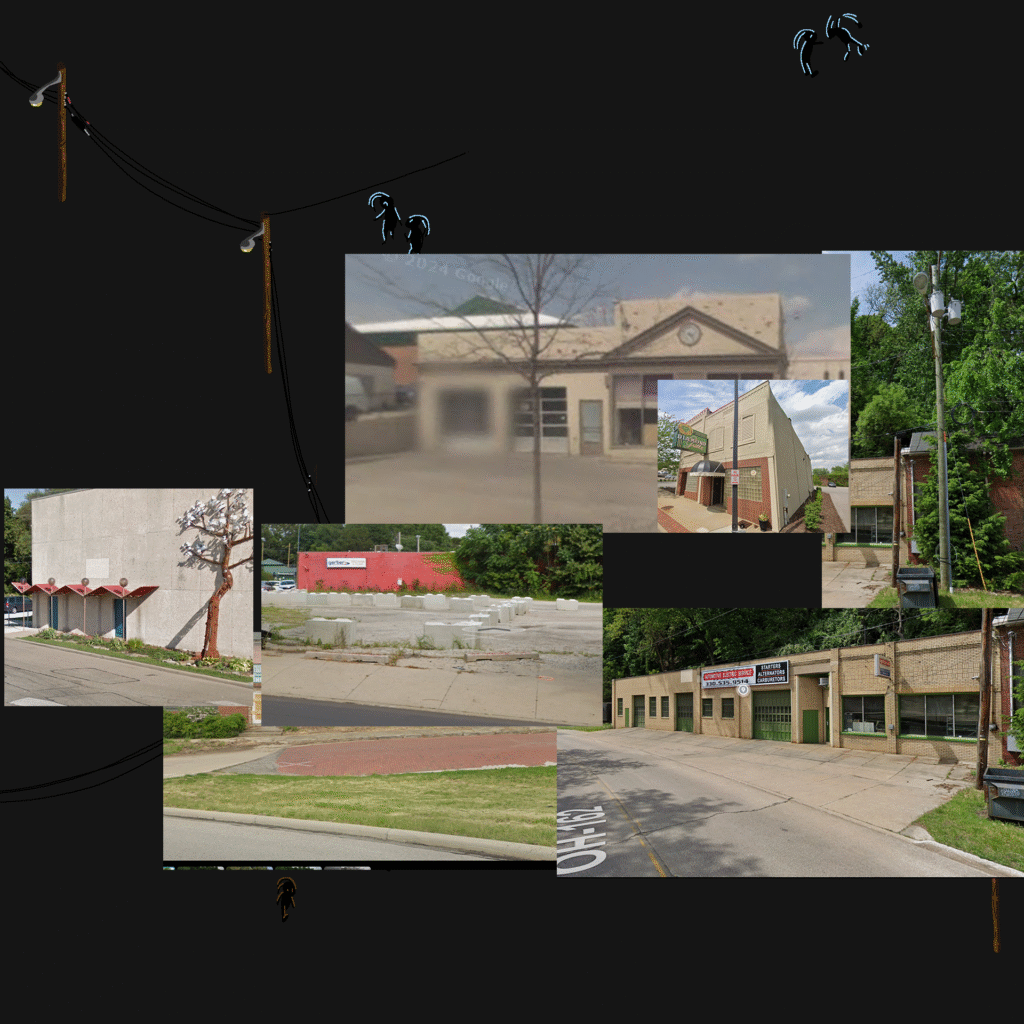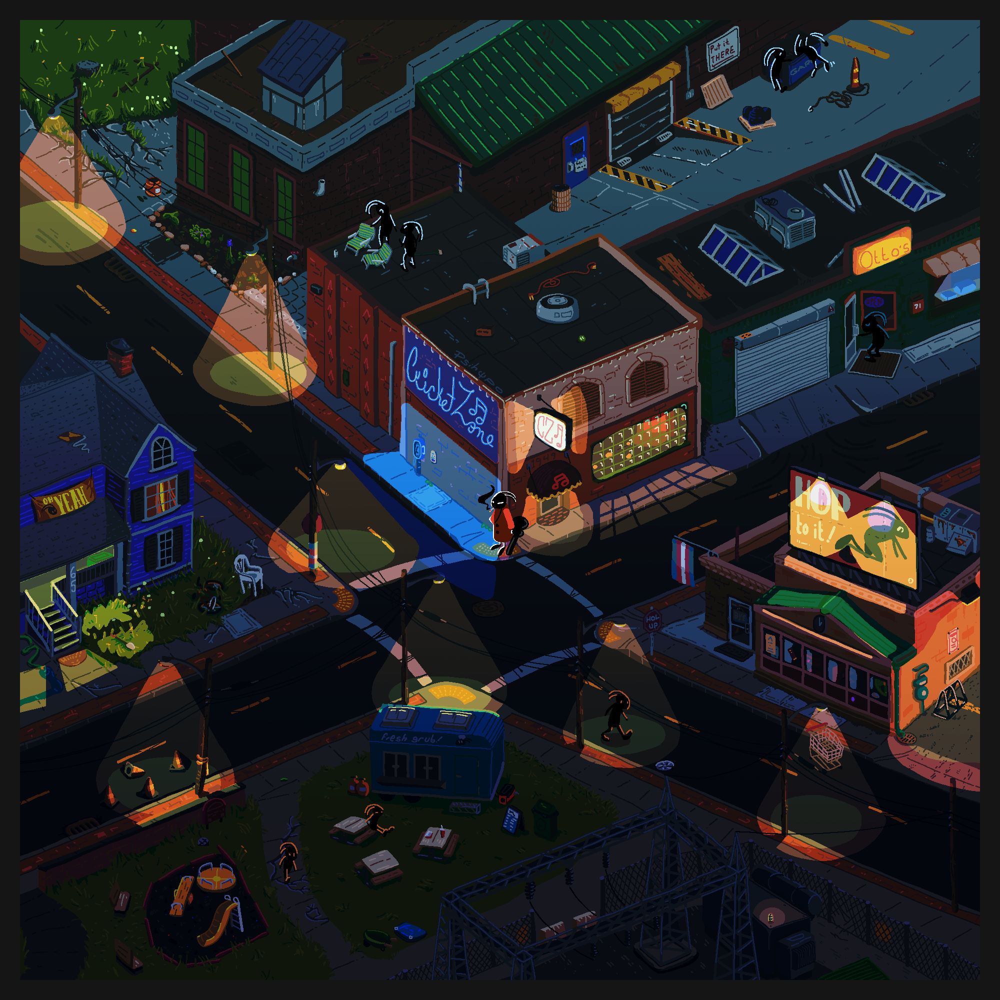 references!! it’s all akron???? the Cricket Zone club itself is based bigtime on a restaurant near my old high school. the blue house is based on where i rented a room for a few years, which sadly almost burned down recently 🙁 the fenced-off area at the bottom was just going to be a construction area with some crates and shipping containers, but i thought a power substation would be more interesting than a lazy patch of dirt. i think the Any Austin videos i had on while drawing had smth to do with that.