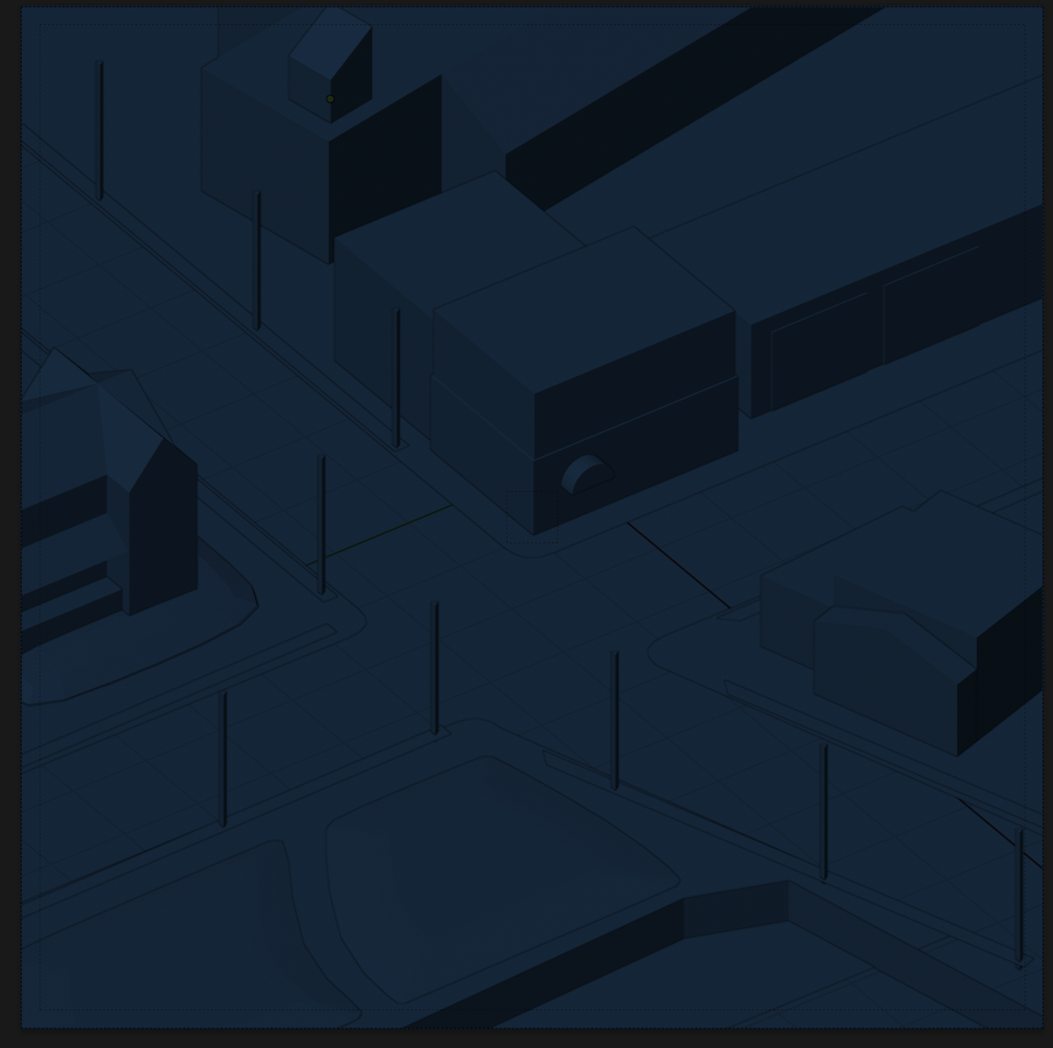 perspective grid base. originally i was going to draw the piece just using a perspective grid. i realized this was going to take a lot of measuring and use of the line tool, which would be really slow. plus it made me too scared to break away from the grid itself, so the buildings were looking to rigid and uniform. so this got scrapped.