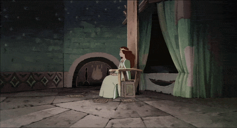The princess sits again and returns to her needlework, but Ample’s words work their way into her mind. A wild hedgehog passes by the window opposite the barred one, hinting at another possible escape route as the day wears on and the princess continues to sit. The sun sets on the village, and another night passes by.