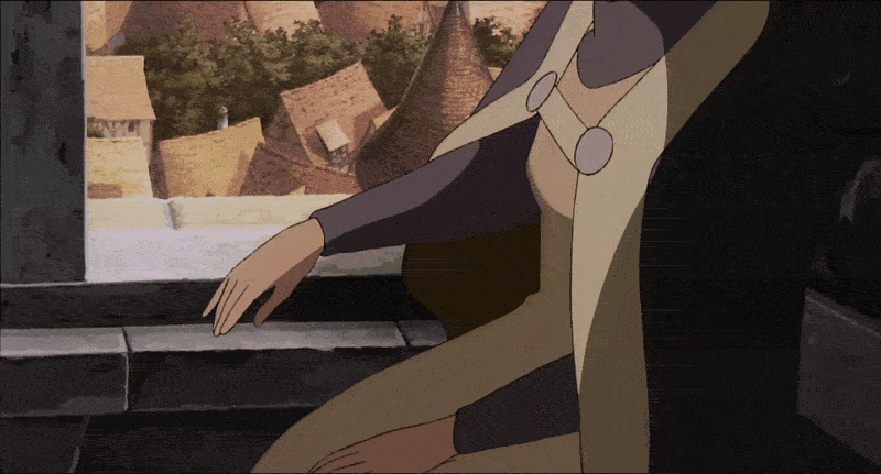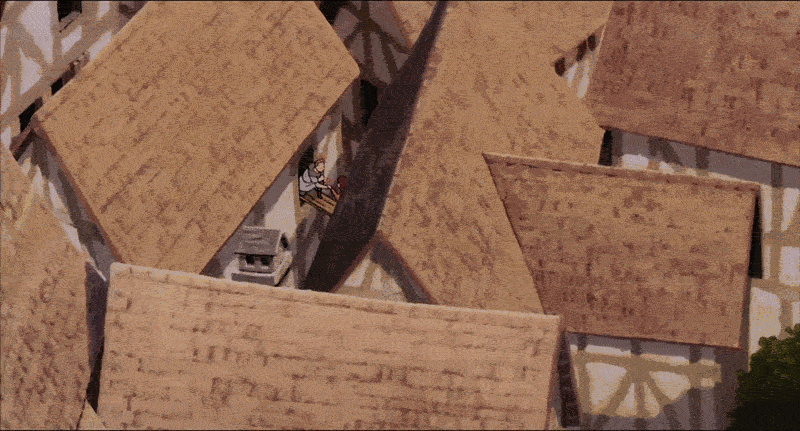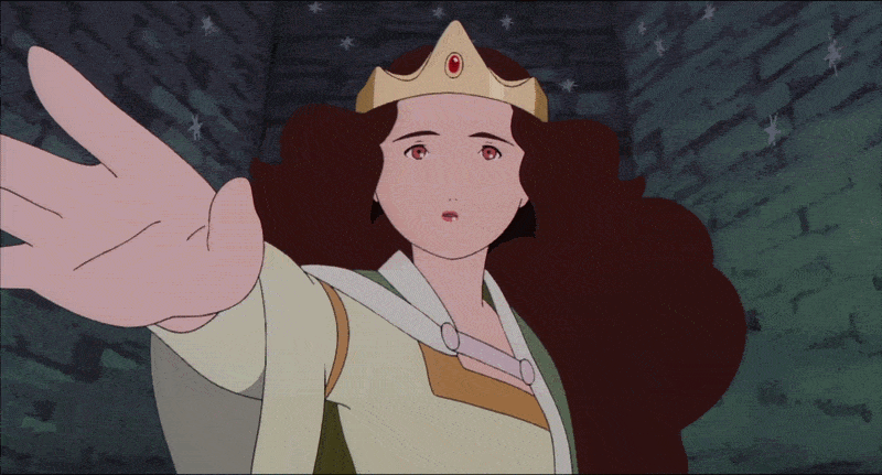 In the night, shooting stars streak across the sky. The film once again indulges in dazzling displays of light; the stars gleam silver through the windows of the castle, through the slit in Arete’s prison chamber, where she sits still. Boax explains to Grovel that they aren’t true falling stars—when he was young, he and some friends put an “artificial moon” into orbit around the earth, but, over time, it’s begun to disintegrate. We see one piece in particular touch the earth near the castle, and, the next morning, Grovel retrieves it and shows it off to Boax.