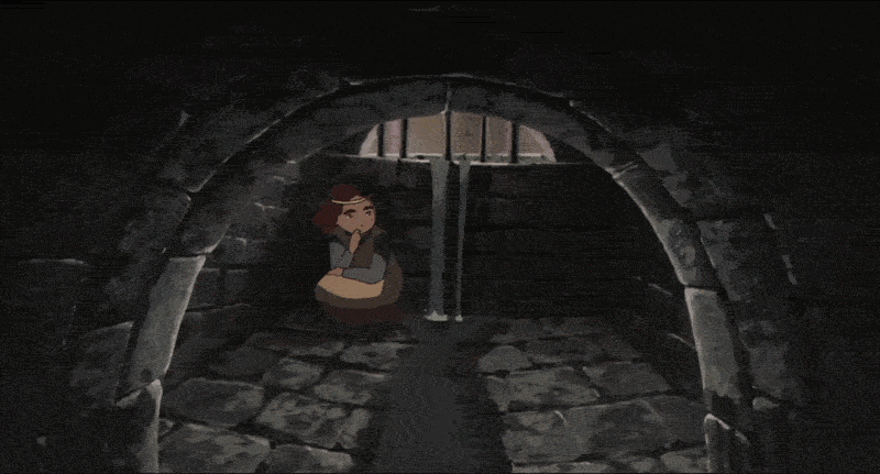 Suddenly, Arete is here. She springs from the rickety throne and throws herself at the dungeon door. It won’t budge. She turns to the other, unobstructed window we saw earlier. Without hesitating, she knocks over her rickety bed, tearing it to pieces, throwing its weight against the wall. She clambers up the wreckage, and only just can’t reach the window. Outside, she hears water running.