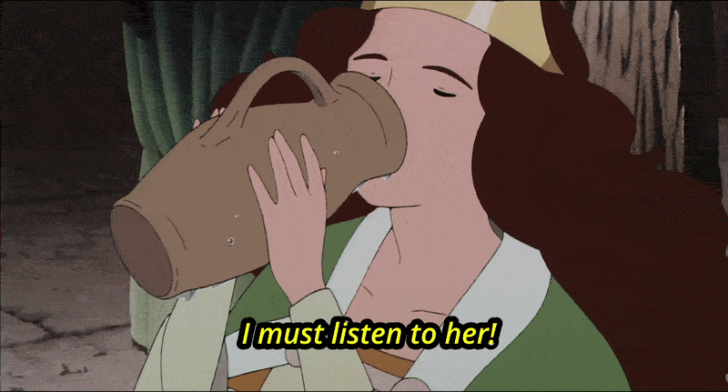 This, too, he shrugs off, explaining to an empty room that he was only doing it to kill time, anyway. Grovel strolls in, laughing about how the princess has spent a second of her three wishes on nothing more than embroidering supplies, with which she will craft cute little pictures to gift to the prince who must surely be on his way to rescue her. With which she will kill time.